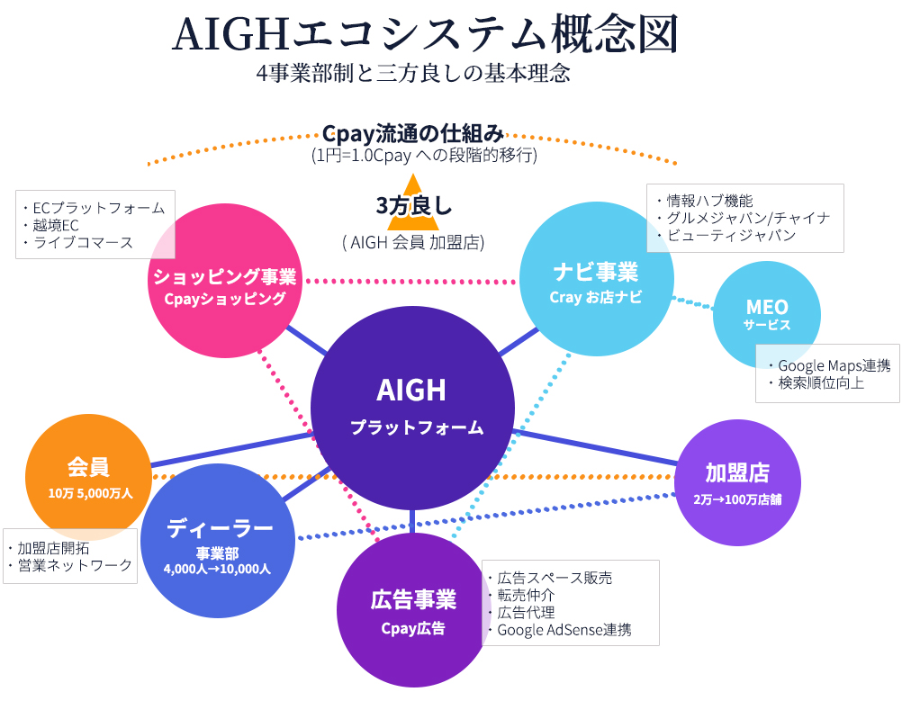 AIグローバルホールディングス株式会社は、「会員/加盟店/AIGHの3⽅良し」を基本理念とした次世代型総合プラットフォーム企業です。当社の革新的なビジネスモデルは、AIによる高度なパーソナライゼーション技術と不動産投資型の広告モデルを組み合わせ、加盟店に代わって広告・プロモーションを行い、会員がCpayをチャージして加盟店でお得に使用し、当社が加盟店の売上(Cpay)を買い取る⾰新的な流通の仕組みを特徴としています。