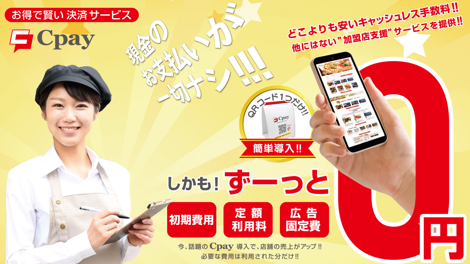 効果の不透明な多額の広告宣伝費を支払う必要はもうありません。「Cpay」を導入するだけで顧客獲得ができる、現金のお支払いのない、全く新しいスマホ決済サービスです。
