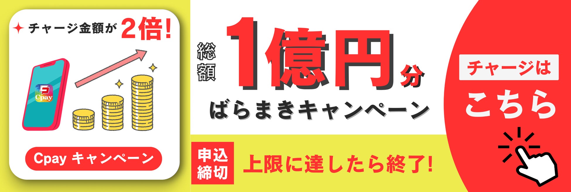 1回限り、最大30万円までのチャージ金額に対し、購入金額と同額のポイントをプレゼントいたします。(合計2倍)例)30,000円チャージ ⇒ 60,000Cpay 付与されます。